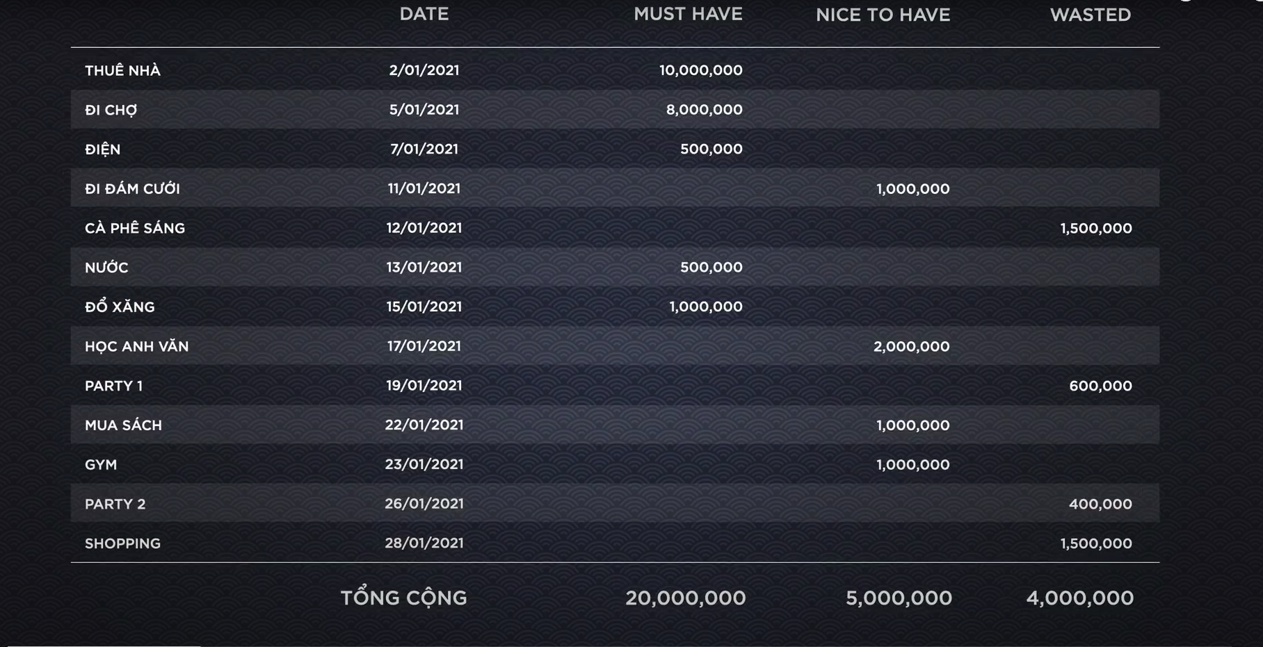 - Wasted: Chi tiêu lãng phí, không có mục đích(Ăn nhậu, mua sắm linh tinh, …).