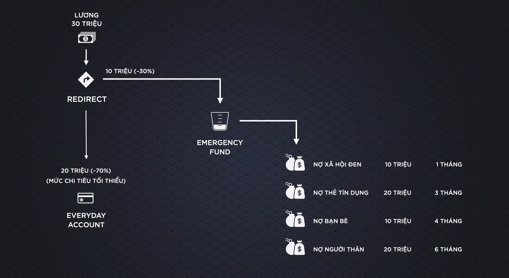 - Emergency Fund: quỹ khẩn cấp, theo đúng tên gọi, trong giai đoạn này, khẩn cấp nhất chính là trả nợ.