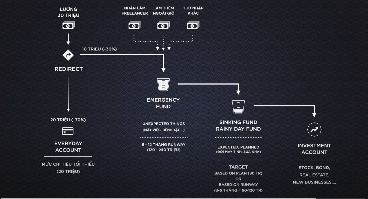 - Ưu tiên đổ đầy quỹ khẩn cấp trước tiên(nếu có những nguồn thu nhập khác sẽ đổ vào đây trước, khi đầy rồi mới đổ vào những quỹ tiếp theo).