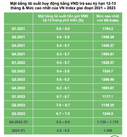 - Dự đoán dự theo lãi suất huy động trong năm 2024, VNI có thể lên cao nhất ở vùng 1.300