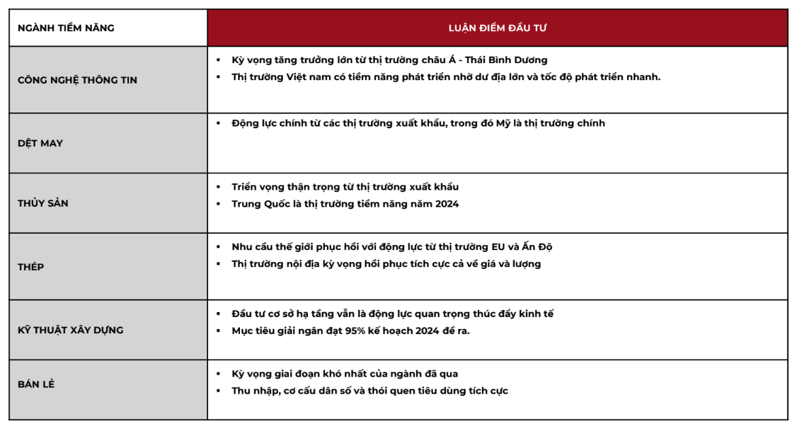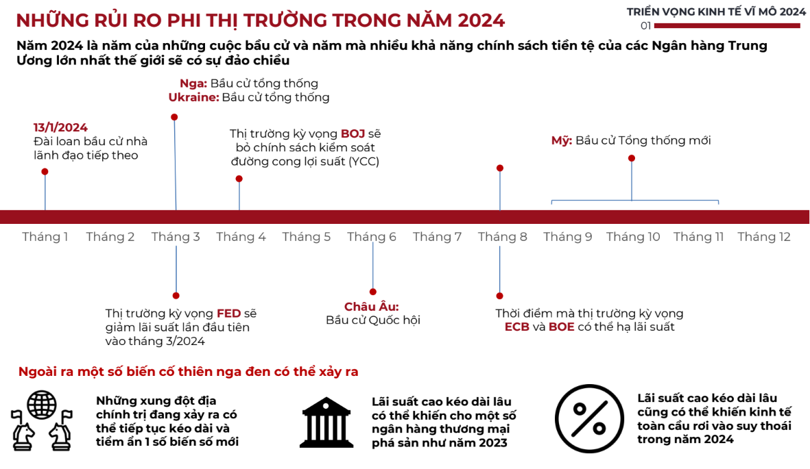 | 🇺🇸 Mỹ | 1. Lạm phát Mỹ giảm chậm hơn kỳ vọng > 2,6%. 2. FED kéo dài thời gian hạ lãi suất đến tận tháng 8. 3. GDP của Mỹ nhỏ hơn 1,5%. 4. Bầu cử tổng thống ảnh hưởng tiêu cực đến thị trường. | 1. Lạm phát giảm theo kỳ vọng, = 2,6%. 2. FED bắt đầu giảm ls từ tháng 6. 3. GDP tăng trưởng ổn định, 1,7%-2%. 4. Bầu cử tổng thống không ảnh hưởng tới thị trường. | 1. Lạm phát giảm mạnh so với kỳ vọng, < 2,6%. 2. FED giảm ls từ tháng 3. 3. GDP > 2%. 4. Bầu cử tổng thống ảnh hưởng tích cực tới thị trường. |