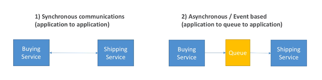 - Bất đồng bộ, đặt ở giữa 2 services một Queue, dữ liệu sẽ đi qua queue rồi mới đến service kia.