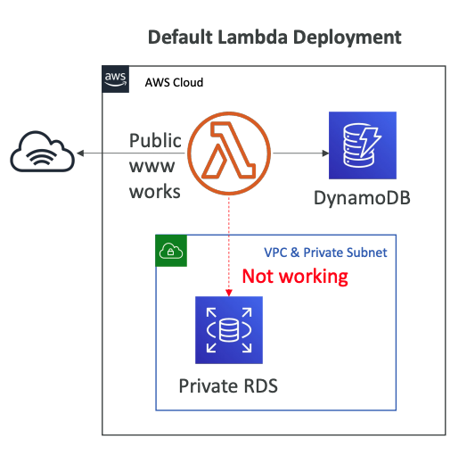 Mặc định Lambda function được launch bên ngoài VPC của chúng ta, nó chạy trong một VPC của AWS. Vì vậy mà nó không thể truy cập được tới các tài nguyên trong VPC của chúng ta(RDS, ElastiCache, internal ELB, …)