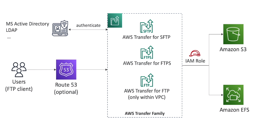 - Là một dịch vụ toàn quyền quản lý, thực hiện chuyển dữ liệu vào hoặc ra khỏi S3 hoặc EFS bằng giao thức FTP.