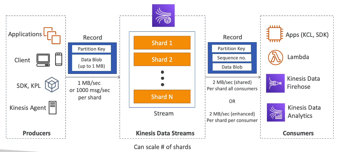 - Producers: AWS SDK, Kinesis Producer(KPL)