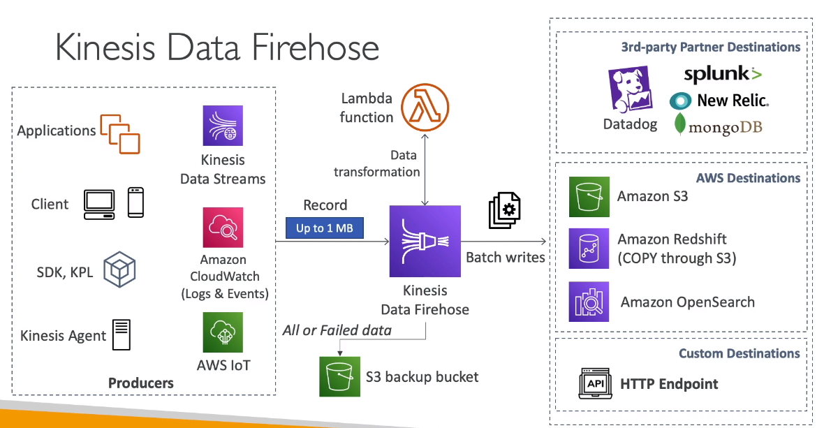 - Kinesis Data Firehose: load data streams vào các dịch vụ lưu trữ của AWS.