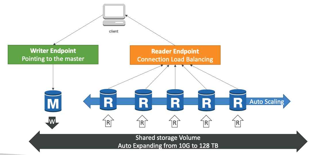 - Luôn chia sẻ dữ liệu lưu trữ với tất cả các cụm(master + read replicas)