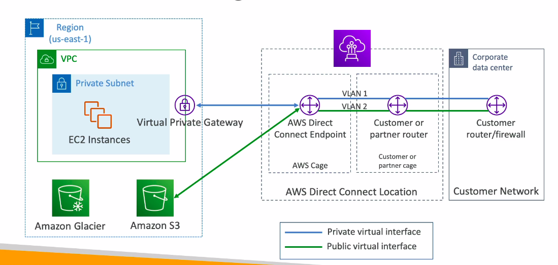 - DX giúp chúng ta vừa có thể kết nối public(như resources của S3) và private(EC2 Instances) trong cùng một kết nối.
