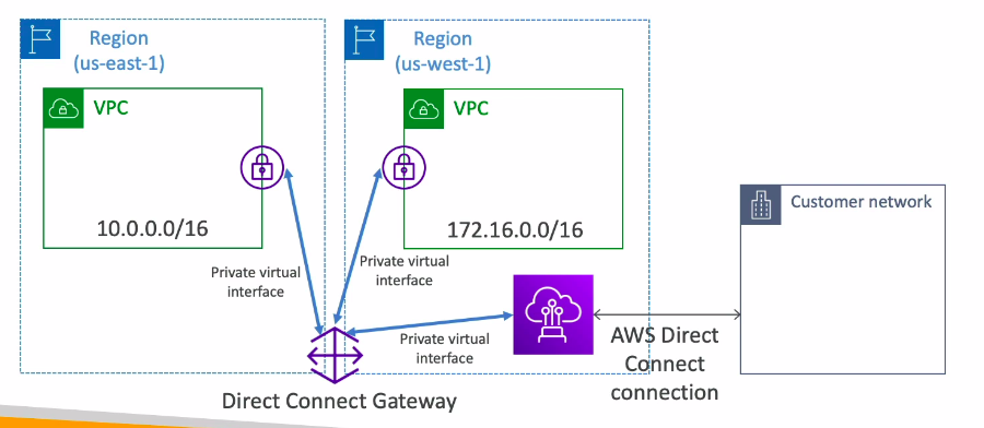 - Nếu chúng ta muốn kết nối giữa nhiều VPC ở khác regions(same accounts), chúng ta cần setup thêm Direct Connection Gateway.