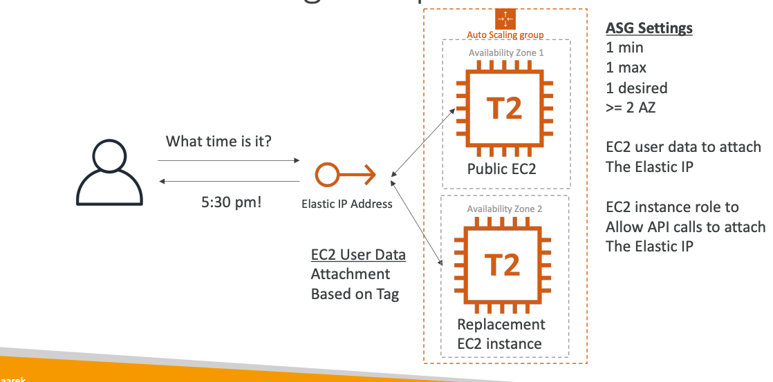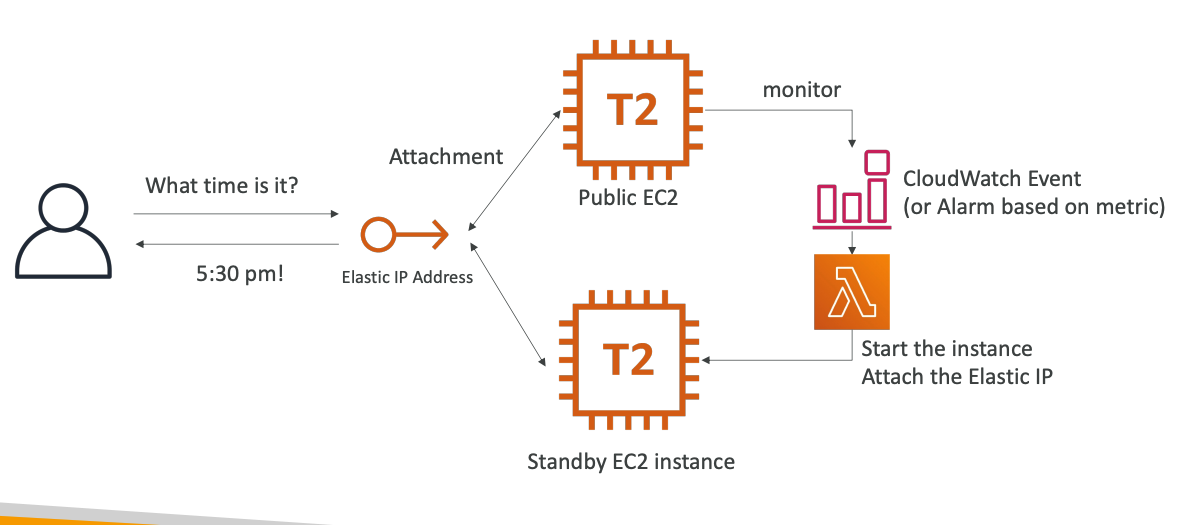 - Sử dụng CloudWatch Event để theo dõi các thông số của EC2 Instance chính, nếu có nó có vấn đề gì bất thường(vd CPU nhảy lên 100% -> lỗi rồi) -> Gửi cho Lambda Function để thực hiện attach ElasticIP qua EC2 Instance. Thế là hệ thống đỡ mất thời gian để launch lại EC2 vì có sẵn rồi.