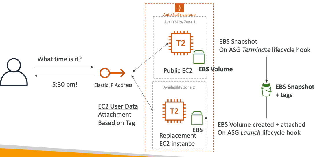 - Có một vấn đề là khi Terminate EC2 Instance, cả EBS Volume sẽ bị xoá theo, để có thể giữ lại nó, ASG sẽ sử dụng lifecycle hook, nó sẽ triggerd khi EBS Volume bị terminate -> tạo ra một EBS Snapshot, khi ASG launch một EC2 Instance mới, EBS cũng sẽ được tạo từ EBS Snapshot. Dữ liệu vẫn sẽ được giữ nguyên.