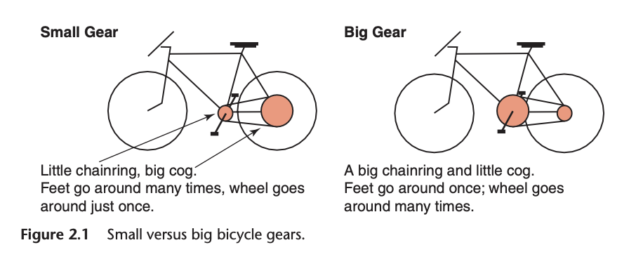 Giả sử bạn có thể thay đổi kích thước của bánh răng và xích xe đạp để phù hợp với nhu cầu sử dụng như đi lên dốc thì dùng bánh răng to và xe dây xích bé để đạp tốn ít sức hơn, ngược lại khi đi đường bằng thì dùng bánh răng nhỏ và dây xích to để bánh sau đi được nhiều vòng hơn trong 1 chu kỳ đạp.