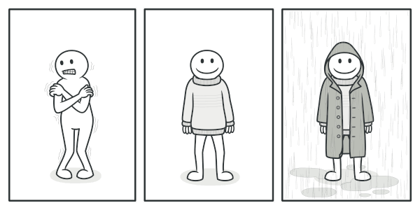 Ví dụ như khi bạn thấy trời bắt đầu hơi lạnh, bạn có thể mặc thêm một chiếc áo len. Khi lạnh hơn nữa, bạn có thể khoác thêm một cái áo khoác. Và khi trời mưa bạn có thể trùm thêm một cái áo mưa. Khi không sử dụng nữa, bạn có thể dễ dàng bỏ nó đi.