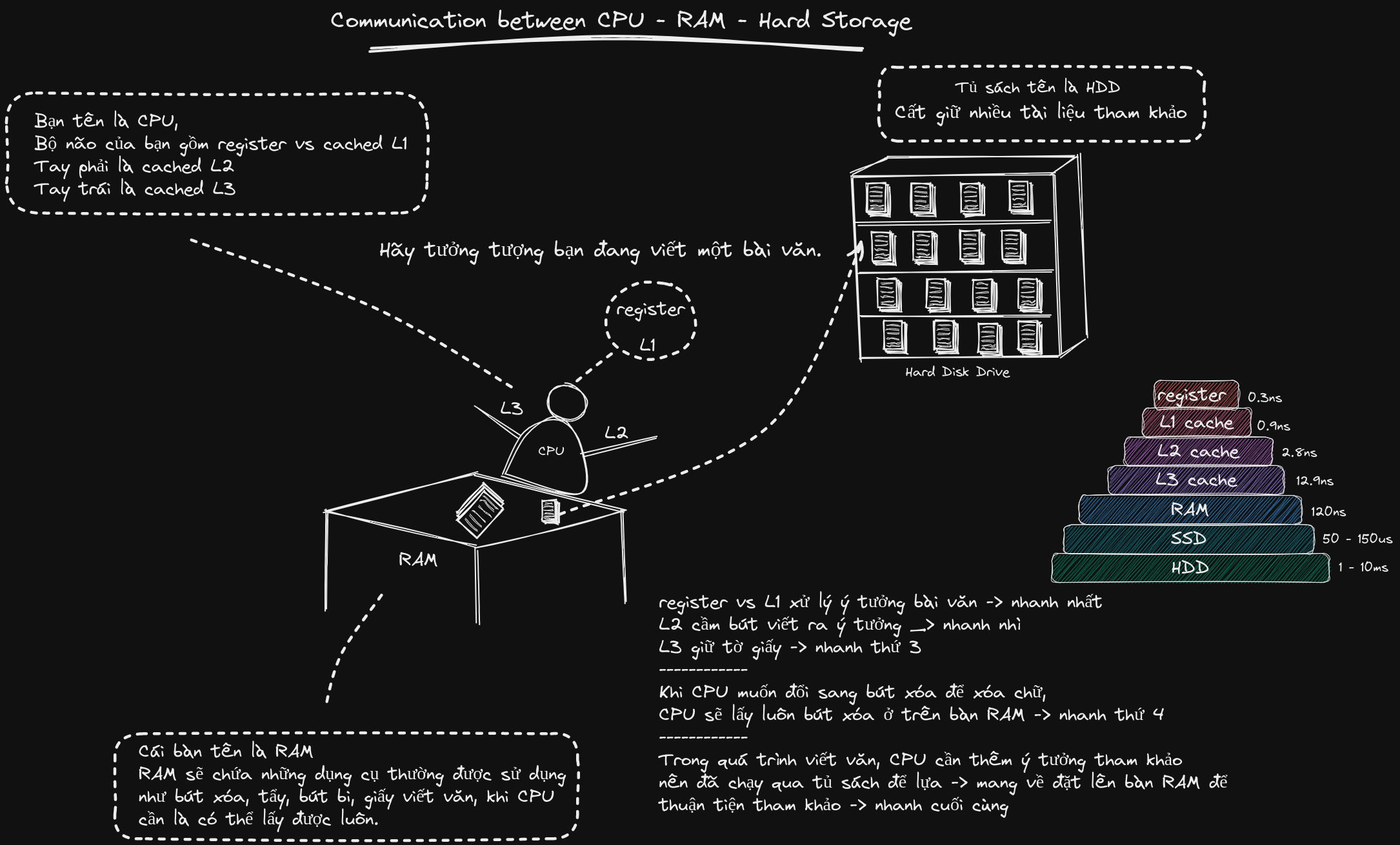 - Thằng nào cần cache, xử lý tốc độ bàn thờ (làm bộ nhớ tạm cho các phần mềm đang chạy) thì người ta dùng tới RAM, CPU.