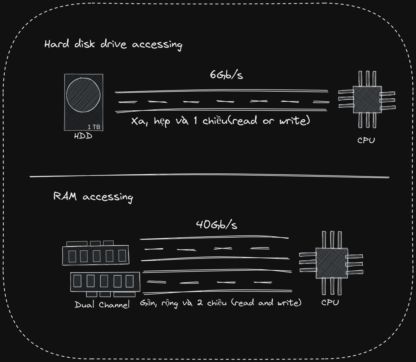 - RAM nằm rất gần CPU và có kết nối băng thông rất cao. Thông lượng của DDR4 là khoản 40Gb/s, ngoài ra RAM còn có thể thực hiện đọc và viết cùng lúc. Khi sử dụng dual channel, RAM sẽ đọc/đọc, viết/đọc, viết/viết chính vì vậy mà nó có thể thao tác một lượng dữ liệu vô cùng lớn trong cùng một thời điểm.