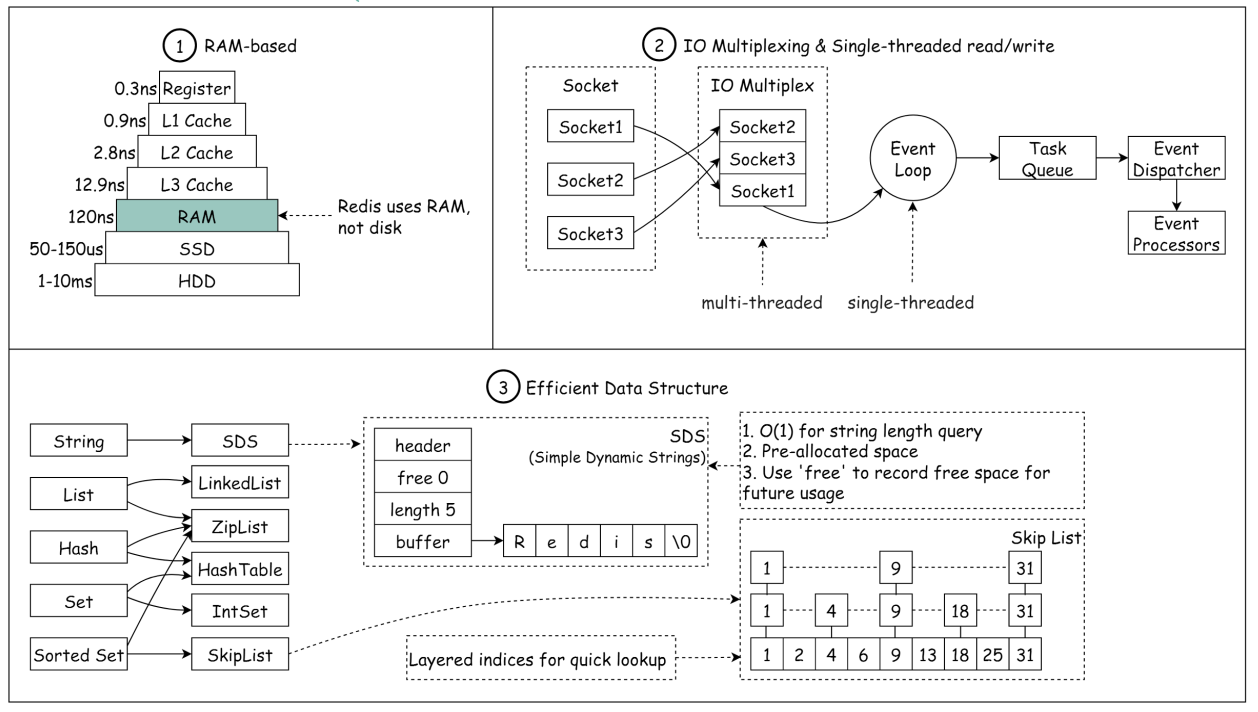 IO multiplexingvàsingle-threaded. IO multiplexing là cơ chế đọc/ghi liên tục của RAM. RAM nhận tất cả các yêu cầu đọc/ghi dữ liệu, để vào một chỗ, sau đó dùng single-threaded lặp qua từng event để tiếp tục xử lý. - Redis sử dụng một vài cấu trúc dữ liệu